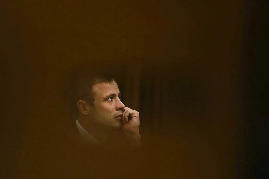 Vận động viên điền kinh nổi tiếng Oscar Pistorius tại tòa án trong ngày thứ tư của phiên xét xử vì tội ngộ sát người yêu của mình, Reeva Steenkamp, vào ngay ngày Valentine năm ngoái. (Ảnh: AP)