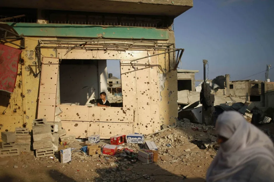 Một cậu bé Palestine bên cử sổ ngôi nhà của mình. Nhà cậu đã bị bắn nát bởi lực lượng Israel trong các trận càn quét chống Hamas. Tổng thống Ai Cập Abdel Fattah al-Sisi kêu gọi Israel xem xét đưa ra các nỗ lực hòa bình mới dựa trên một sáng kiến của các quốc gia Ả Rập từ năm 2002 nhưng bị từ chối bởi nhà nước Do Thái. (Ảnh: Reuters)