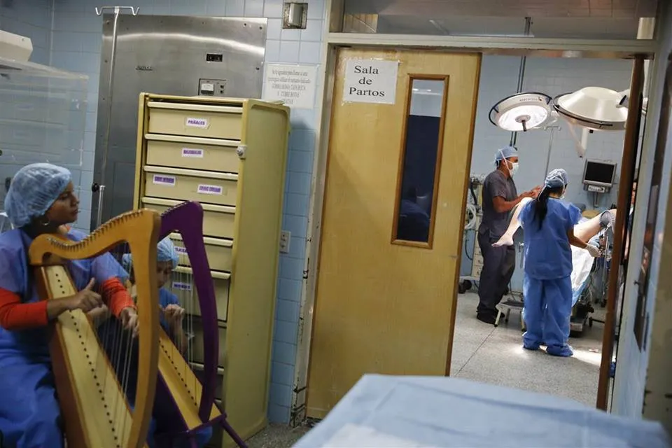 Các thành viên của "El Sistema" (hệ thống) chơi đàn hạc bên ngoài phòng hộ sinh, nơi một phụ nữ sinh con tại một bệnh viện phụ sản ở Caracas. Trong một quốc gia tràn ngập súng và với một tỷ lệ giết người cao nhất thế giới, tổ chức El Sistema tìm cách chống sự lại tiếp xúc của trẻ em nghèo với bạo lực bằng sự nhẹ nhàng và đầy cảm hứng của âm nhạc cổ điển. (Ảnh: Reuters)
