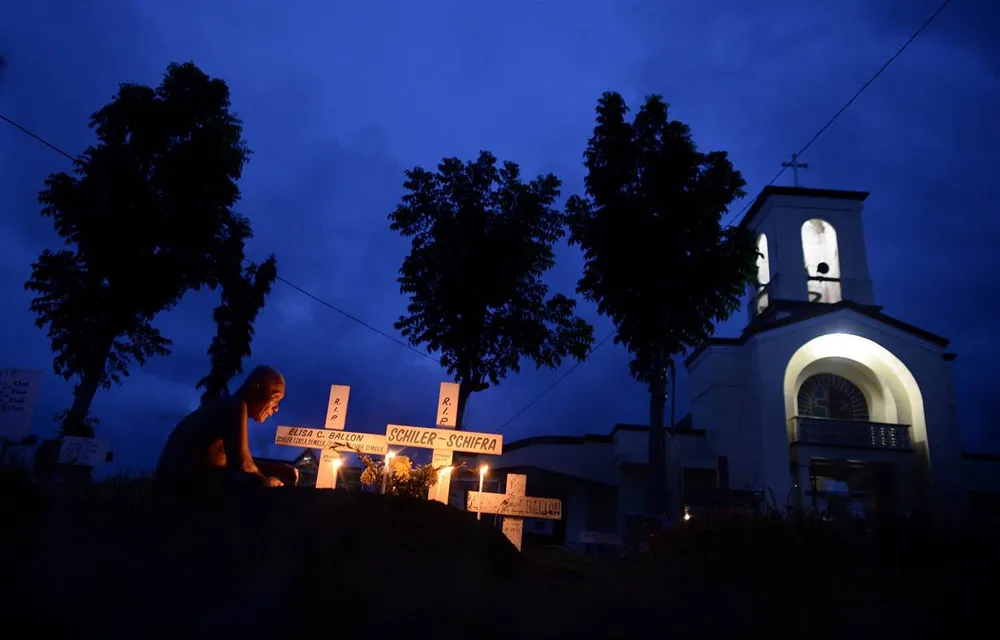 Tưởng niệm 1 năm Siêu Bão Hải Yến: Một người thân của nạn nhân thiệt mạng trong trận bão Hải Yến tại một nghĩa trang quần chúng gần nhà thờ San Joaquin ở Palo, Philippines. Gần 7000 người thiệt mạng và mất tích trong trận siêu bão này một năm trước. (ảnh: AFP)