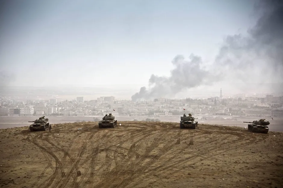 Quân đội Thổ Nhĩ Kỳ đang quan sát chiến sự ở thành phố Kobani, bên kia biên giới với Syria. Lực lượng người Kurd vẫn quyết tâm tử thủ trước sự tấn công của IS dù họ đã mất 40% thành phố. (Ảnh: Nur Photo)