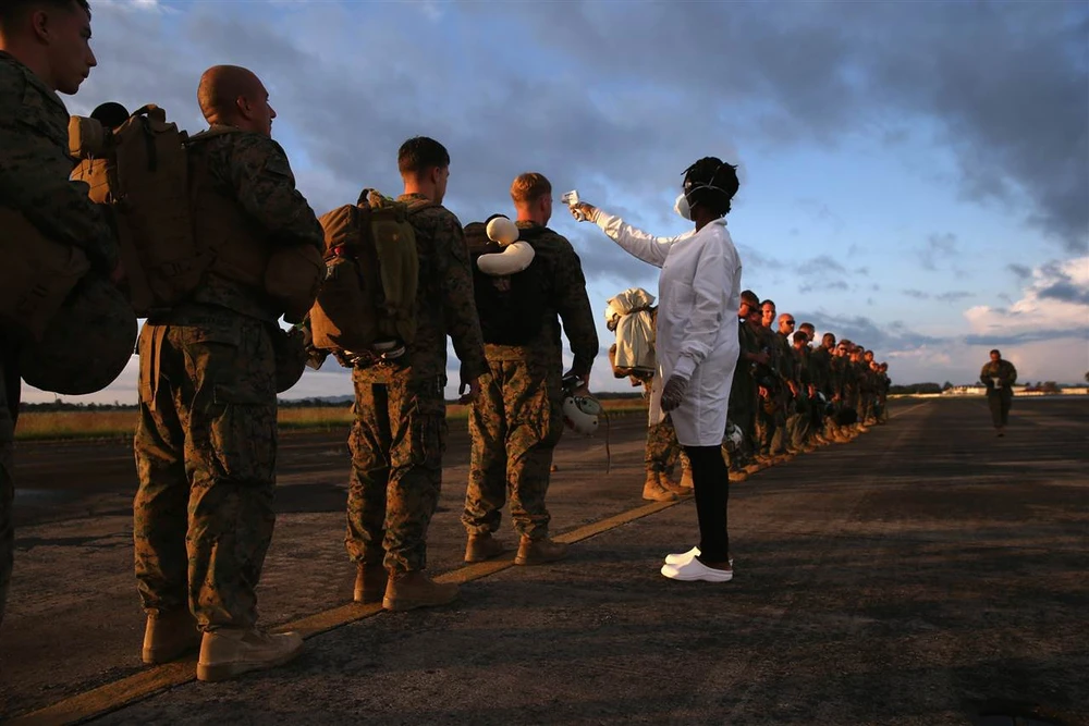 Một nhân viên y tế đang kiểm tra thân nhiệt của thủy quân lục chiến Mỹ ở tỉnh Monroevia, Liberia. Khoảng 90 lính thủy quân lục chiến Mỹ đã được đưa đến đây để giúp chính phủ Liberia ngăn chặn dịch bệnh Ebola. (Ảnh: John Moore)