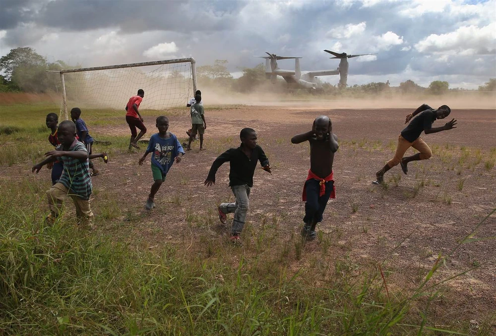 Những đứa trẻ chạy trốn khói bụi từ một chiếc trực thăng Osprey MV-22 của thủy quân lục chiến Hoa Kỳ. Mỹ đã bắt tay xây dựng một trung tâm điều trị Ebola tại tỉnh Tubmanburg, Liberia. (Ảnh: John Moore)