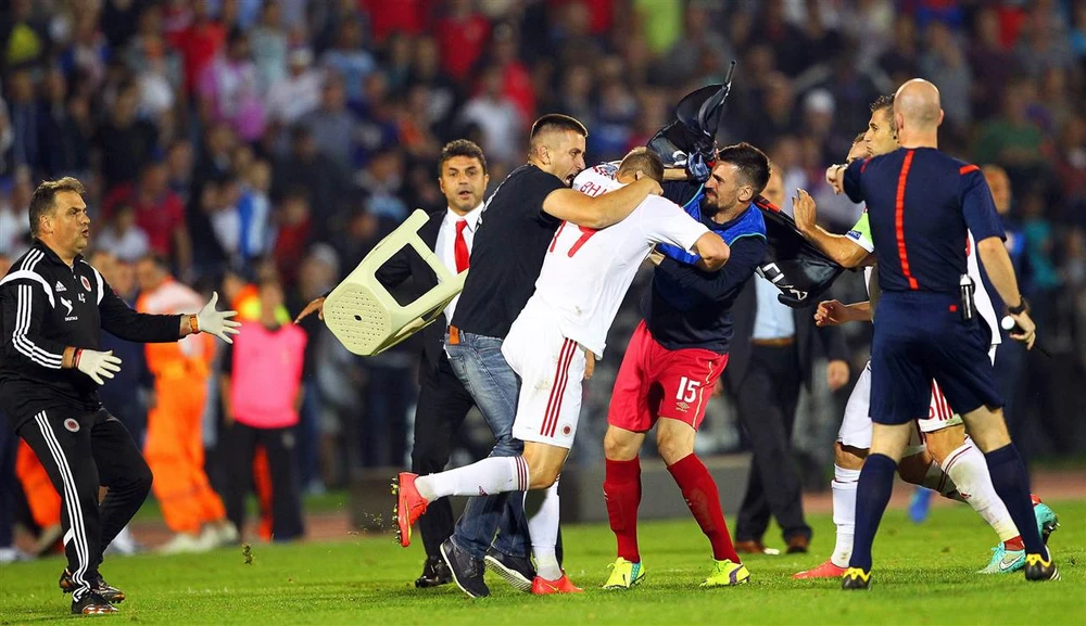 Cuộc ẩu đả giữa các cầu thủ Albani, Serbia và những khán giả quá khích tại một trận đấu thuộc vòng loại Euro 2016. Các CĐV của Albani đã treo một lá cờ của Kosovo nơi có nhiều người sắc tộc Albani sinh sống. Kosovo đã tuyên bố ly khai từ Serbia. (Ảnh: EPA)
