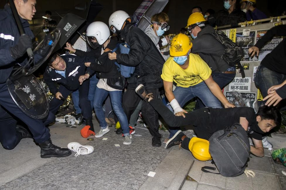 12. Tuần rồi, cảnh sát và sinh viên lại một lần nữa đụng độ nhau ngay trước Cơ quan Lập pháp Hong Kong. Cảnh sát chống bạo động và lực lượng nhân công dọn dẹp của chính quyền đã đuổi đánh và bắt giữ nhiều sinh viên. (Ảnh: Reuters)