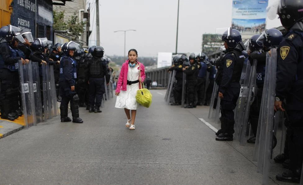 10. Cảnh sát chống bạo động Mexico vẫn thắt chặt an ninh tại thủ đô nước này. Trong ảnh, một đứa trẻ bước vào sân bay Mexico giữa hai hàng cảnh sát chống bạo động. (Ảnh: Reuters)