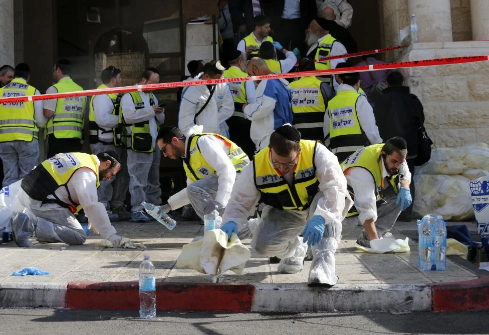 3. Đội phản ứng nhanh Israel đang “lau dọn” hiện trường vụ thảm sát tại một nhà thờ Do Thái giáo tại Jerusalem. (Ảnh Reuters)