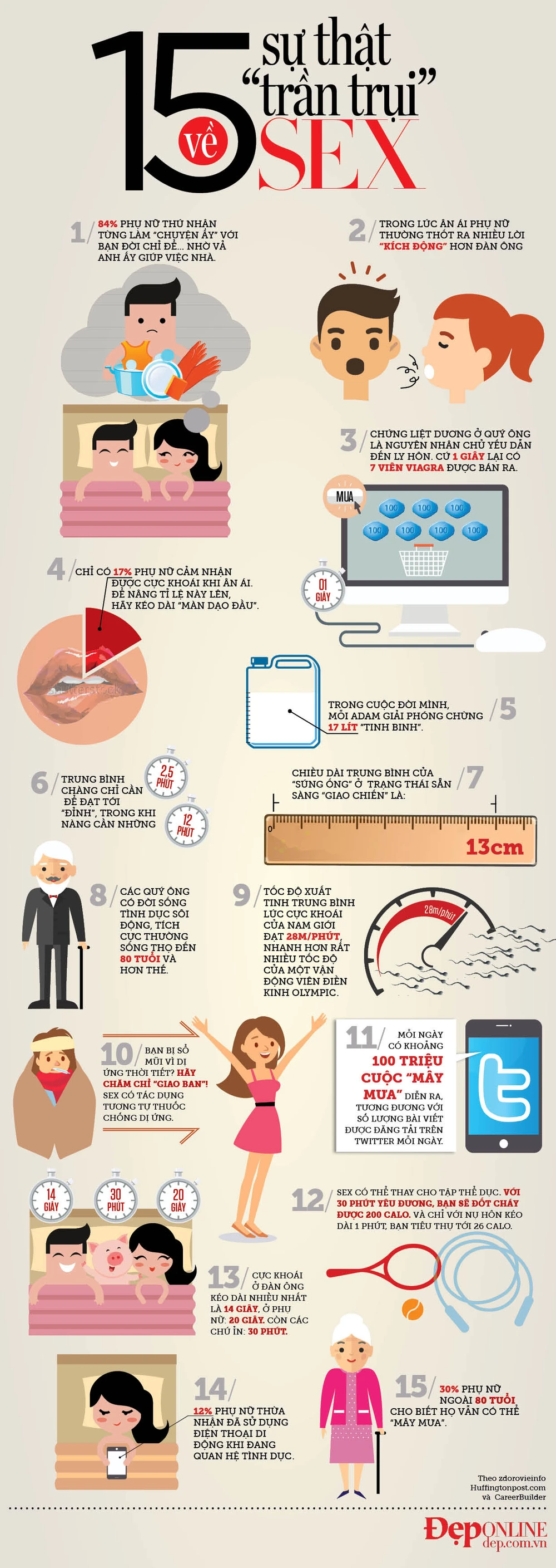 Có đến 84% phụ nữ thổ lộ rằng họ từng làm "chuyện ấy" với bạn đời chỉ để... dễ sai khiến anh ấy làm việc nhà; Thời gian cực khoái mà một chú ỉn cảm nhận được nhiều hơn ở một người đàn ông cả trăm lần... Và còn nhiều sự thật "trần trụi" khác mà bạn sẽ tìm thấy trong infographics dưới đây.