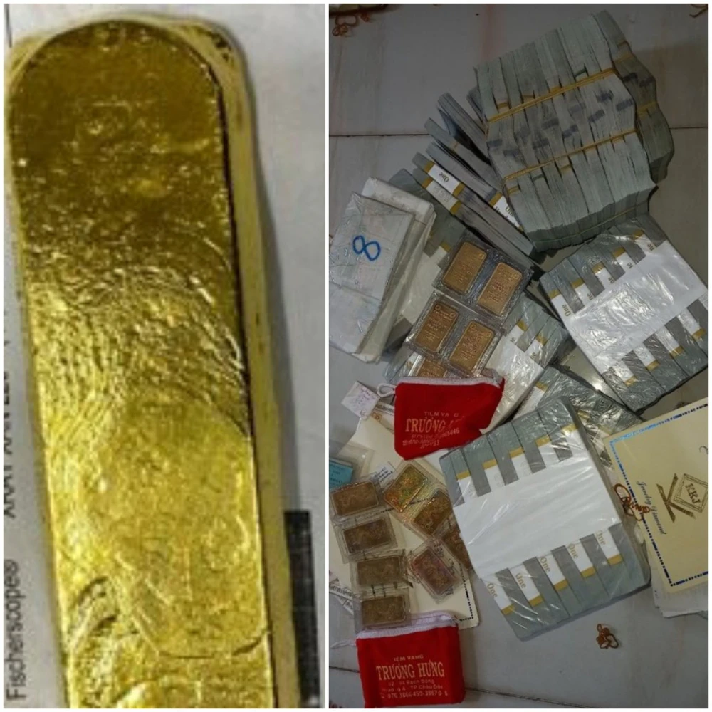 Số vàng và tiền mặt công an thu giữ được sau khám xét. Ảnh: QM