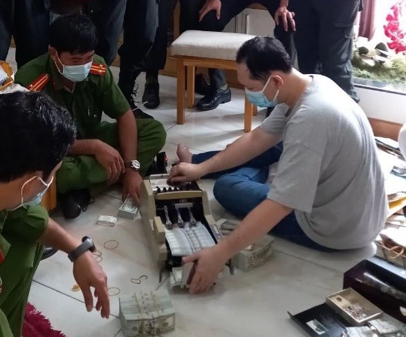 Công an phát hiện nhiều đô la và tiền mặt tại các nơi khám xét. Ảnh: QM