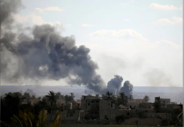 Các cột khói được nhìn thấy ở thị trấn Baghouz, tỉnh Deir Ez Zor, Syria hôm 3-3. Ảnh: REUTERS