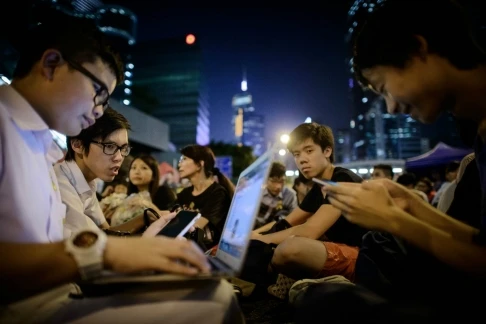 Sinh viên biểu tình sử dụng Laptop và Firechats (Ảnh: AFP)