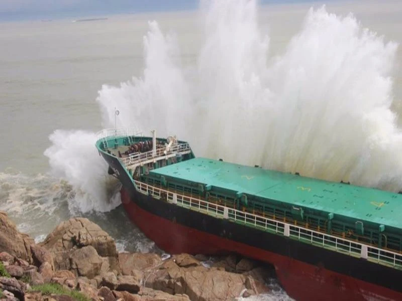 Một tàu hàng bị sóng đánh trôi dạt vào bờ gây hư hỏng.