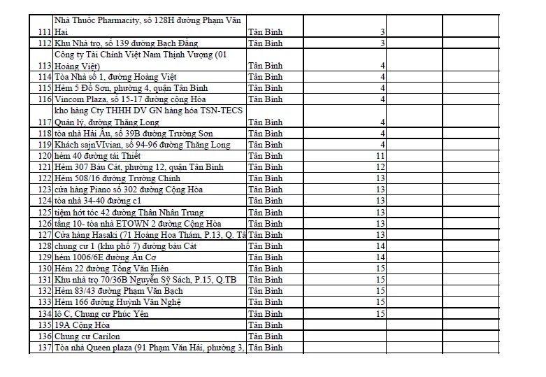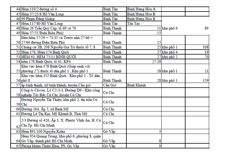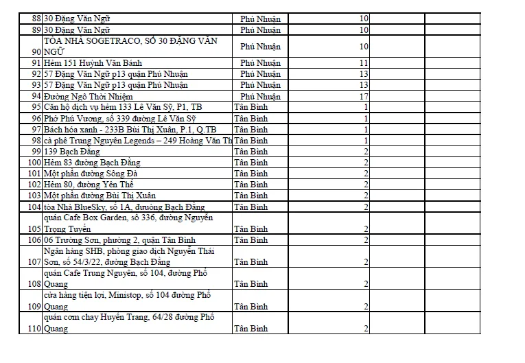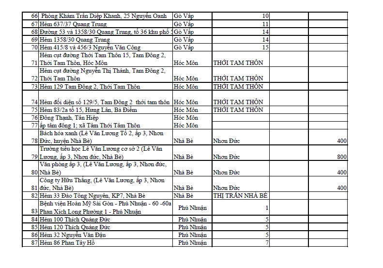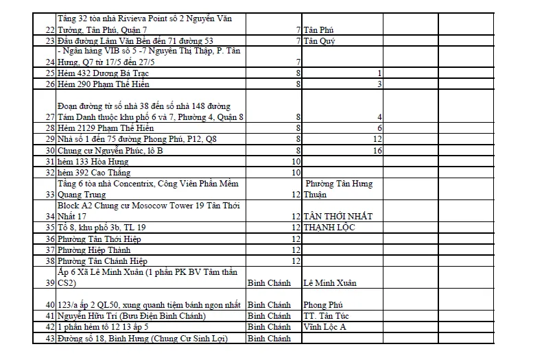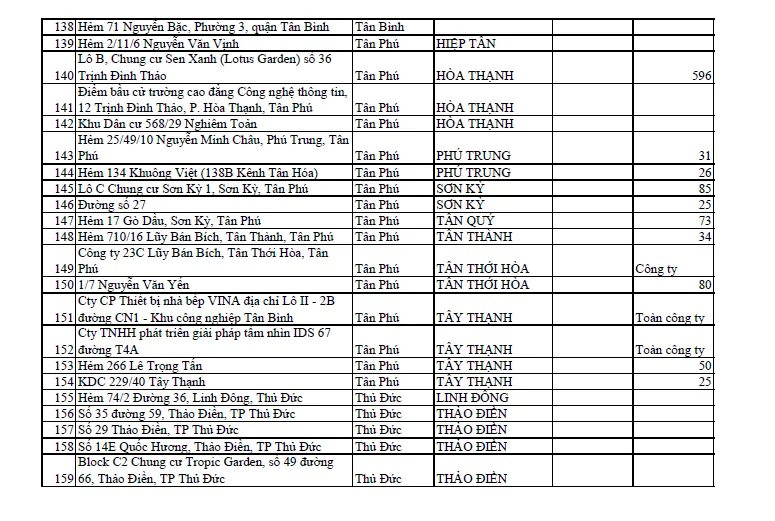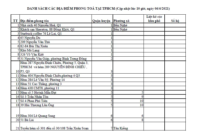 Từ ngày 27-5 đến nay, TP.HCM phát hiện nhiều ca mắc COVID-19, chủ yếu liên quan điểm nhóm hội thánh truyền giáo Phục hưng, nhiều địa điểm buộc phải phong tỏa để phòng chống dịch. Tính đến 10 giờ ngày 6-6, Trung tâm Kiểm soát Bệnh tật TP.HCM thống kê được 153 địa điểm ở TP.HCM được phong tỏa để phòng chống dịch. 153 địa điểm cụ thể như sau: