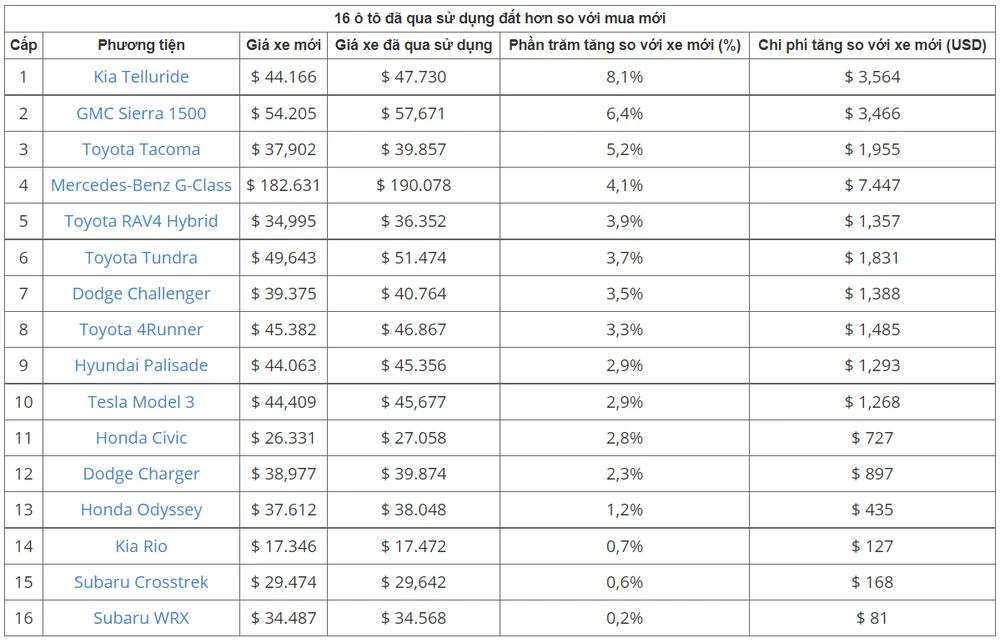 Bảng danh sách 16 ô tô đã qua sử dụng đắt hơn xe mới do iSeeCars cung cấp.