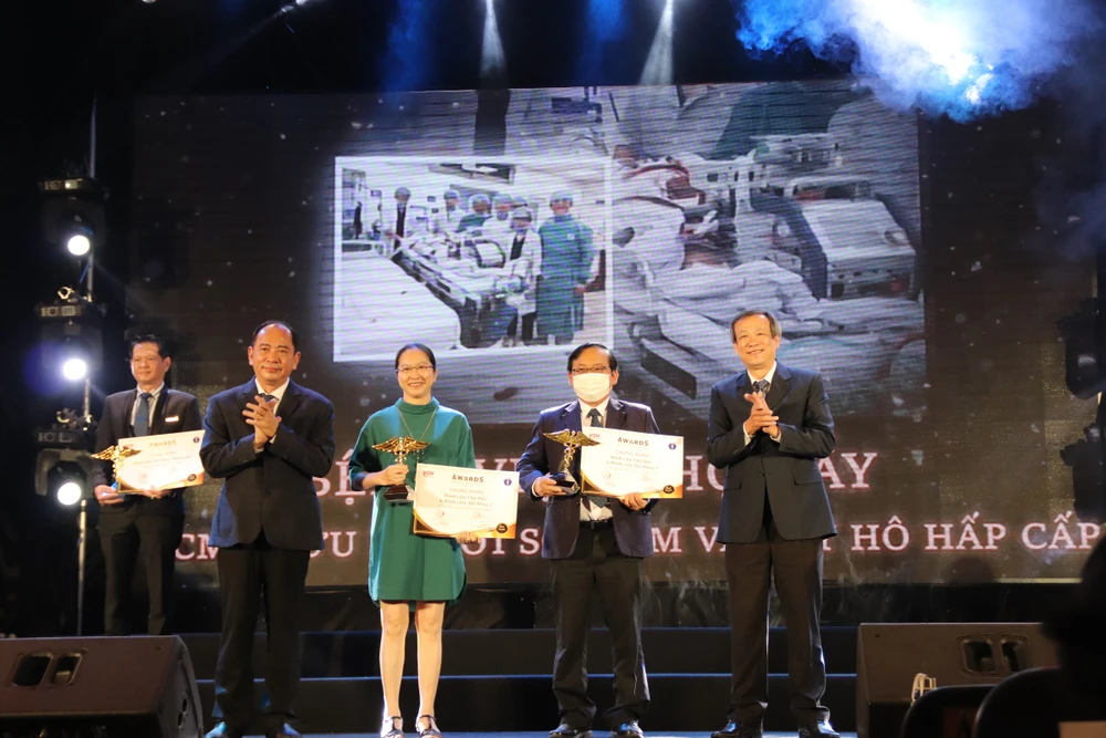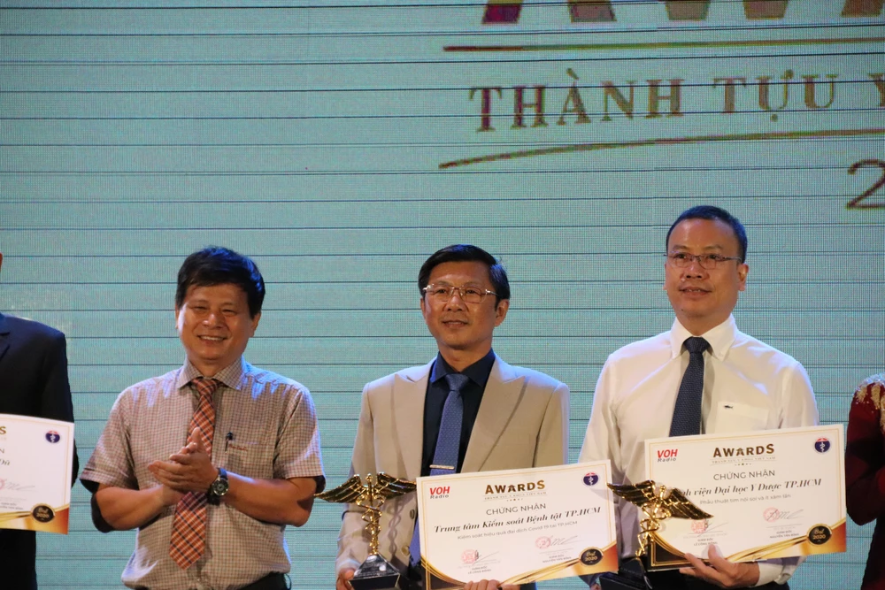 Đại diện Trung tâm Kiểm soát Bệnh tật TP.HCM với thành tựu: kiểm soát hiệu quả đại dịch COVID-19 tại TP.HCM và Bệnh viện Đại học Y dược TP.HCM với thành tựu: Phẫu thuật tim nội soi và ít xâm lấn được vinh danh tại buổi lễ. Ảnh: HL