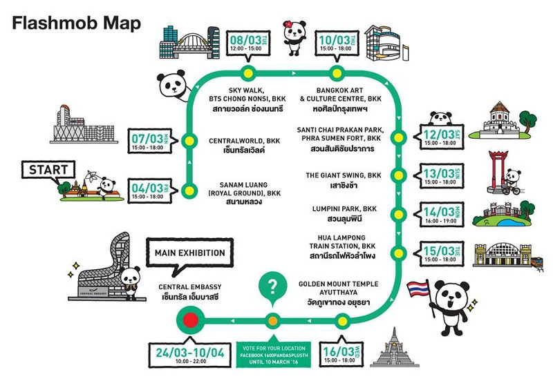 Sau đó, những chú gấu trúc sẽ lần lượt di chuyển đến các địa điểm khác trong thành phố như trung tâm thương mại Central World, ga BTS Chong Nonsi, Trung tâm Nghệ thuật và Văn hóa Bangkok, Công viên Santi Chai Fort, chùa Wat Suthat…