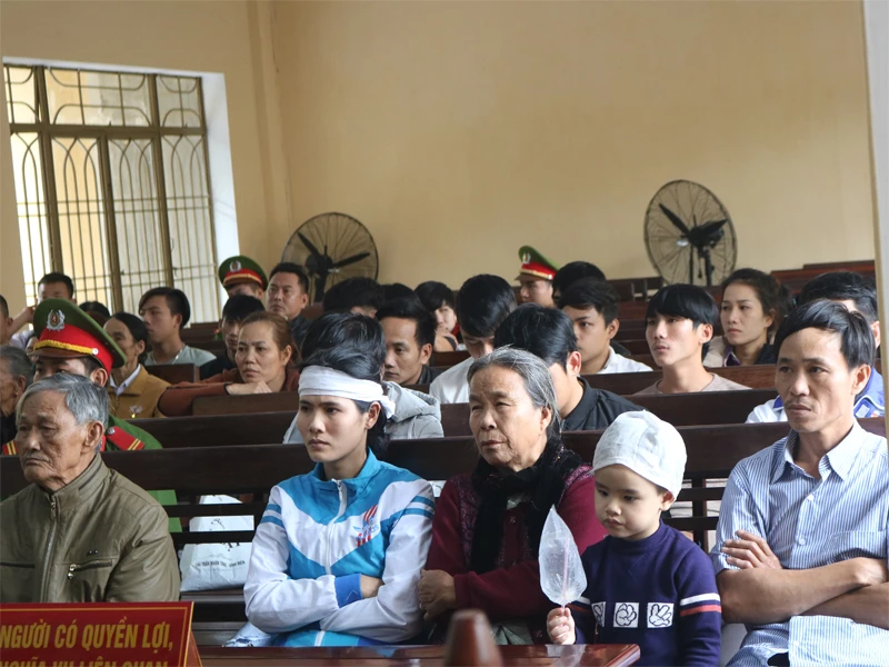 Người nhà bị hại đeo khăn tang đến tòa. Ảnh: HUY TRƯỜNG