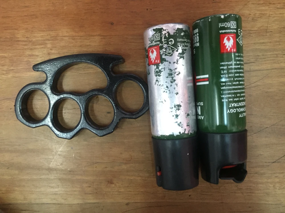 Bình xịt hơi cay và nắm đấm bằng thép thu giữ. Ảnh CTV CHÂU THÀNH