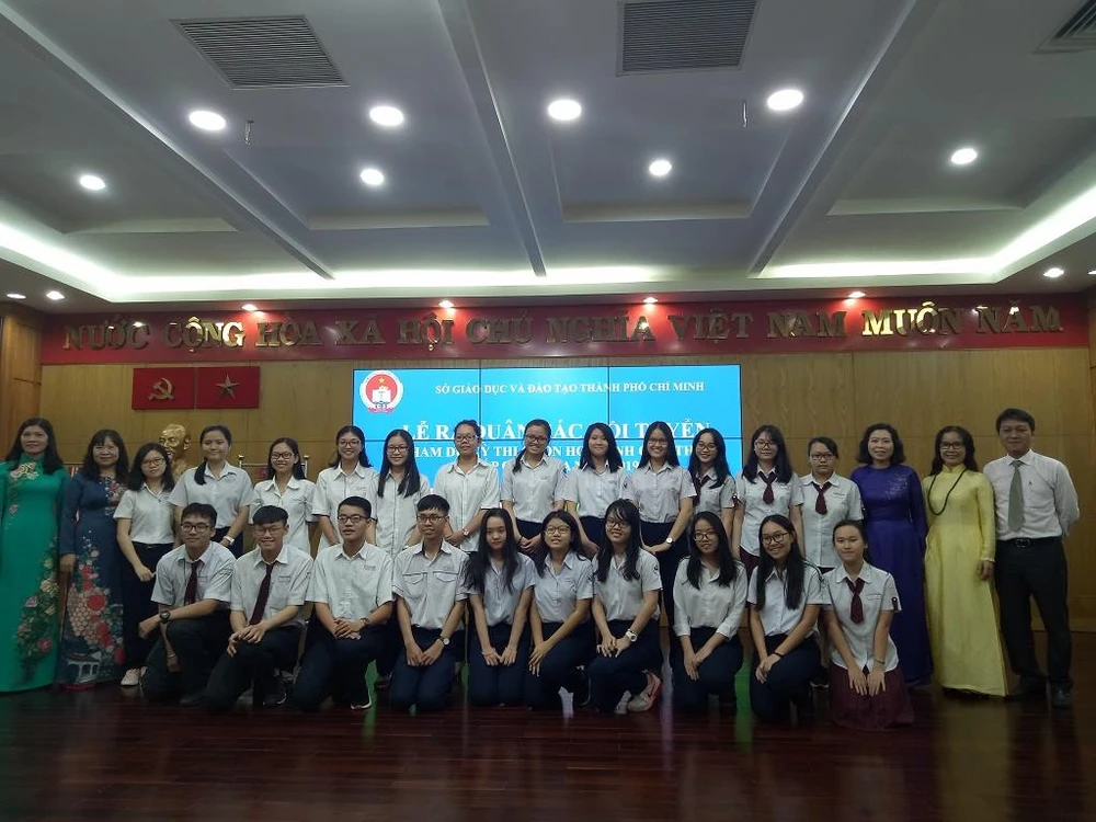 Ban Giám đốc Sở GD&ĐT TP.HCM chụp hình cùng đội tuyển. Ảnh: TRÚC PHƯƠNG