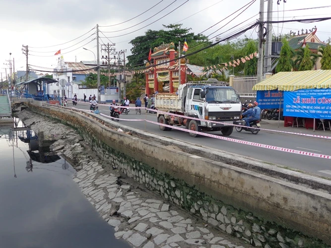 Theo dự án chống sạt lở đoạn bờ bến Bình Đông được khởi công sáng nay sẽ xây dựng bờ kè mới dài 100 m từ trước cửa Chùa Long Hoa, rộng 5 m và cao trình kè đạt 2,2 m.