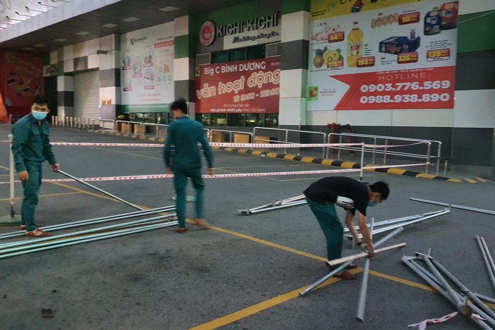 Lực lượng dân quân dựng nhà bạt phong tỏa Big C vì có liên quan đến trường hợp dướng tính với COVID-19. Ảnh: LA