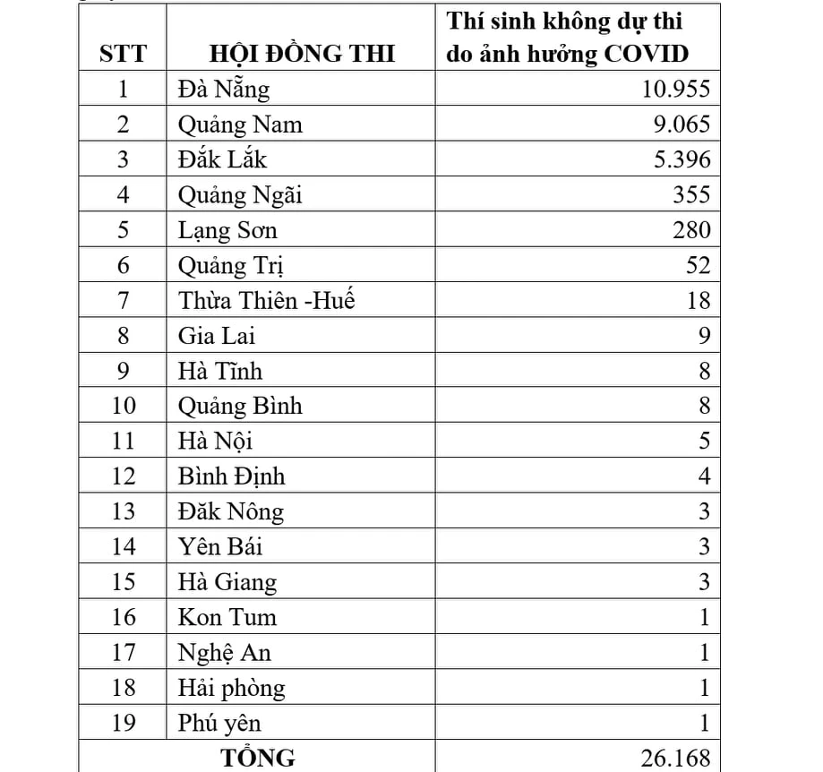 Báo cáo nhanh của Bộ GD&ĐT về kỳ thi tốt nghiệp THPT chiều 8-8, cho biết trong ngày làm thủ tục dự thi chiều nay có 19 tỉnh, TP với 26.168 thí sinh không dự thi do ảnh hưởng của dịch COVID-19.
