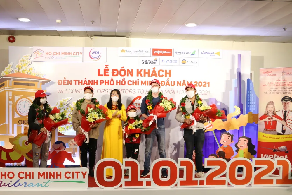 Sáng 1-1, Sở Du lịch TP.HCM, Hiệp hội Du lịch TP.HCM, Cảng hàng không quốc tế Tân Sơn Nhất, Cảng vụ hàng không miền Nam cùng các hãng hàng không và các doanh nghiệp (DN) du lịch tổ chức Lễ đón khách đến TP.HCM đầu năm 2021.