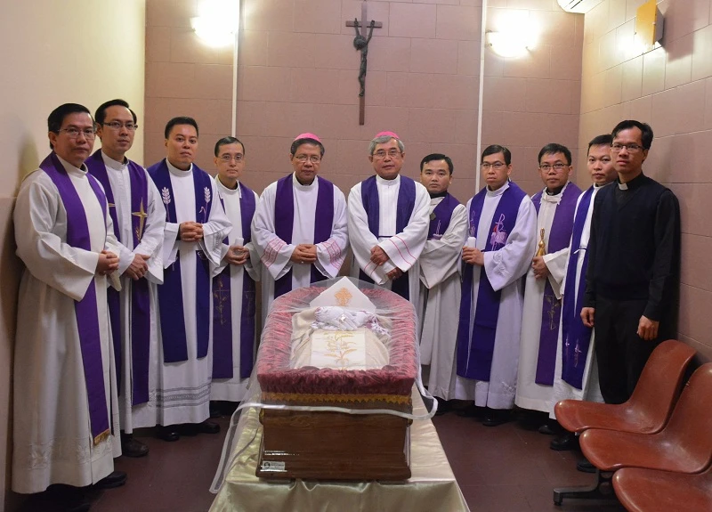 Các linh mục, giám mục tham gia nghi thức tẩn liệm Đức Tổng giám mục Phaolô Bùi Văn Đọc - Ảnh: Salêdiêng Don Bosco Việt Nam