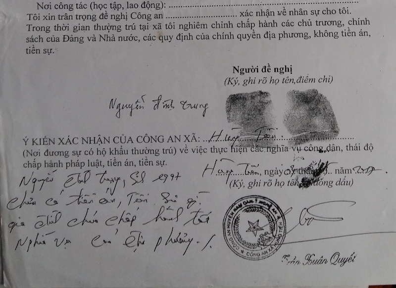 Sau khi xuất ngũ trở về địa phương, anh Trung (con trai thứ hai của vợ chồng ông Hùng) cũng làm hồ sơ thủ tục xin việc làm và đi xuất khẩu lao động ở nước ngoài. Ngày 3-5-2017, ông Quyết cũng ghi trong đơn xác nhận nhân sự của anh Trung là: “Nguyễn Đình Trung (SN 1997) chưa có tiền án, tiền sự gì, gia đình chưa chấp hành tốt nghĩa vụ của địa phương”.