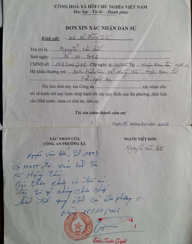 Để hoàn thành hồ sơ, ngày 16-11-2016, anh Bắc làm đơn xin xác nhận dân sự. Phần xác nhận của công an phường, xã thì ông Trần Xuân Quyết - Trưởng Công an xã Hùng Tiến phê vào tờ đơn xin xác nhận của anh Bắc với nội dung "Nguyễn Văn Bắc (SN 1993, có hộ khẩu thường trú xóm Bình Sợn, xã Hùng Tiến) bản thân chưa có tiền án, tiền sự nhưng chưa chấp hành tốt các quy định của địa phương". Với lời phê trên, anh Bắc bị công ty từ chối tiếp nhận làm việc. Anh Bắc làm hồ sơ xin đi xuất khẩu lao động cũng bị lời phê tương tự và bị từ chối hồ sơ đi xuất khẩu lao động ở nước ngoài.