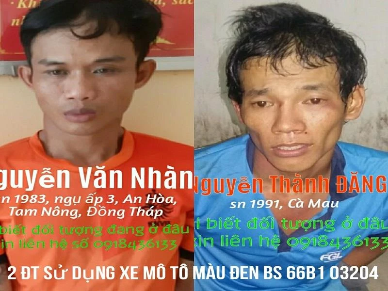 Ngày 28-5, Cơ quan CSĐT Công an huyện Tam Nông (Đồng Tháp) ra quyết định truy nã đối với Nguyễn Văn Nhàn (36 tuổi, ngụ tại xã An Hoà, huyện Tam Nông, Đồng Tháp), Nguyễn Thành Đăng (28 tuổi, ngụ Hàng Vịnh, huyện Năm Căn, Cà Mau).