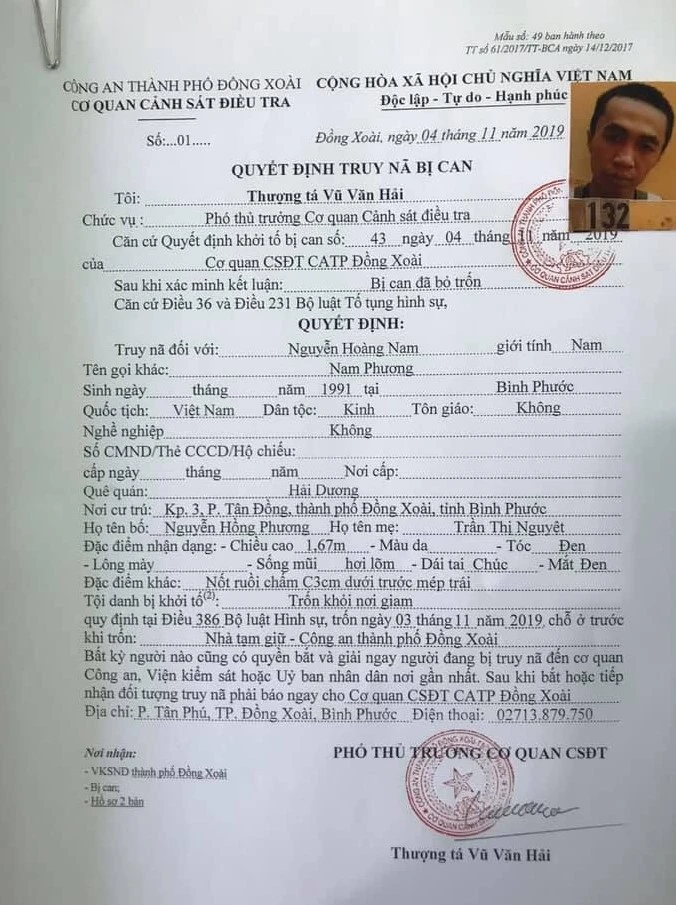 Đặc điểm nhận dạng: Nguyễn Hoàng Nam cao khoảng 1m67, tóc đen, sống mũi hơi lõm, có nốt ruồi chấm cách 3 cm dưới trước mép trái.