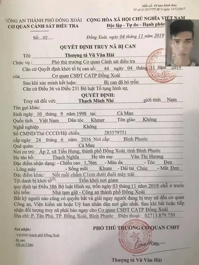 Công an TP Đồng Xoài (tỉnh Bình Phước) vừa ký quyết định truy nã Nguyễn Hoàng Nam (28 tuổi) và Thạch Minh Nhí (21 tuổi) về tội trốn khỏi nơi giam.