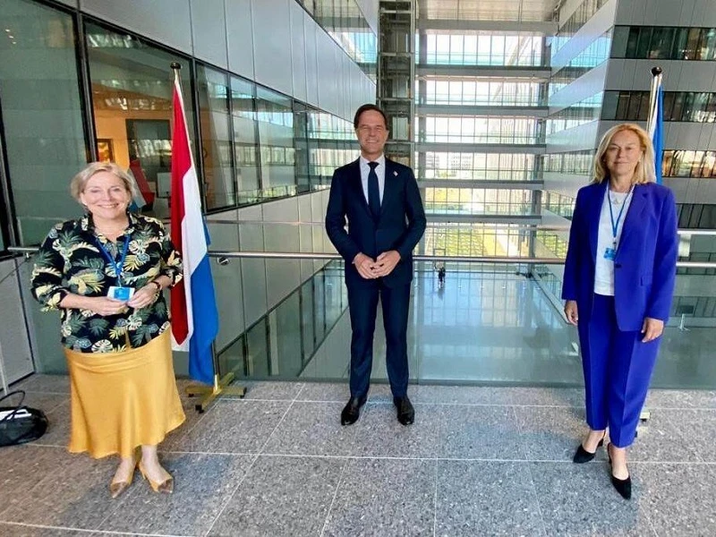 Thủ tướng lâm thời Mark Rutte (giữa), bà Sigrid Kaag (phải) và bà Ank Bijleveld (trái) đại diện Hà Lan tại hội nghị thượng đỉnh NATO hồi tháng 6. Ảnh: BỘ QUỐC PHÒNG HÀ LAN