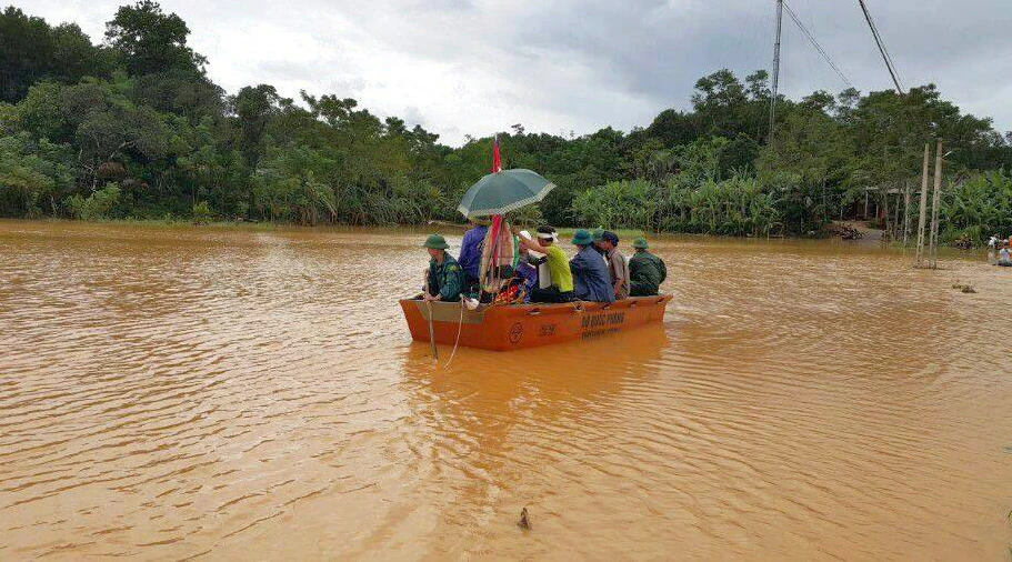 Lực lượng quân đội và người thân phải đưa quan tài cụ Nguyễn Thị Thiệu (96 tuổi, ở thôn 1, xã Sơn Giang, huyện Hương Sơn, Hà Tĩnh) lên ca nô vượt lũ đến nghĩa trang.
