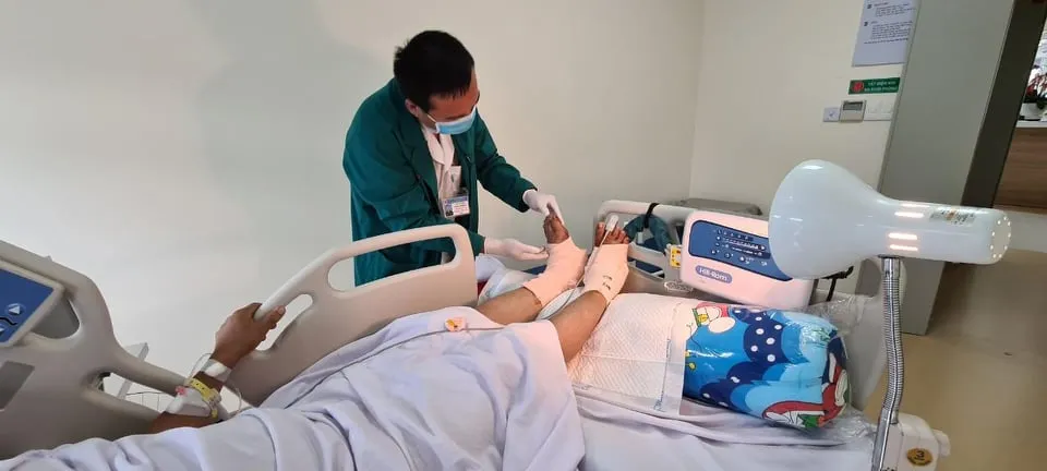 Bệnh nhân tiếp tục được chăm sóc sau khi nối liền hai chân. Ảnh: AC