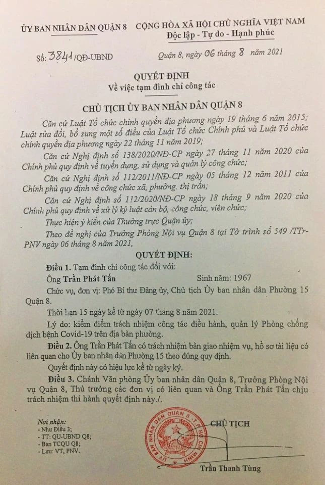 Ngày 7-8, Chủ tịch UBND quận 8 Trần Thanh Tùng đã ký quyết định tạm đình chỉ công tác cán bộ đối với ông Trần Phát Tấn, Chủ tịch UBND phường 15, để kiểm điểm trách nhiệm của người đứng đầu trong công tác phòng chống dịch COVID-19 trên địa bàn phường này.
