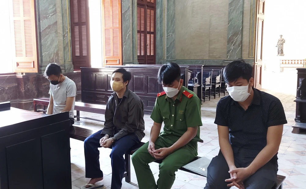 Bị cáo Đức (ngồi giữa), Lâm, Tùng ngồi ngoài bìa. Ảnh: H.YẾN