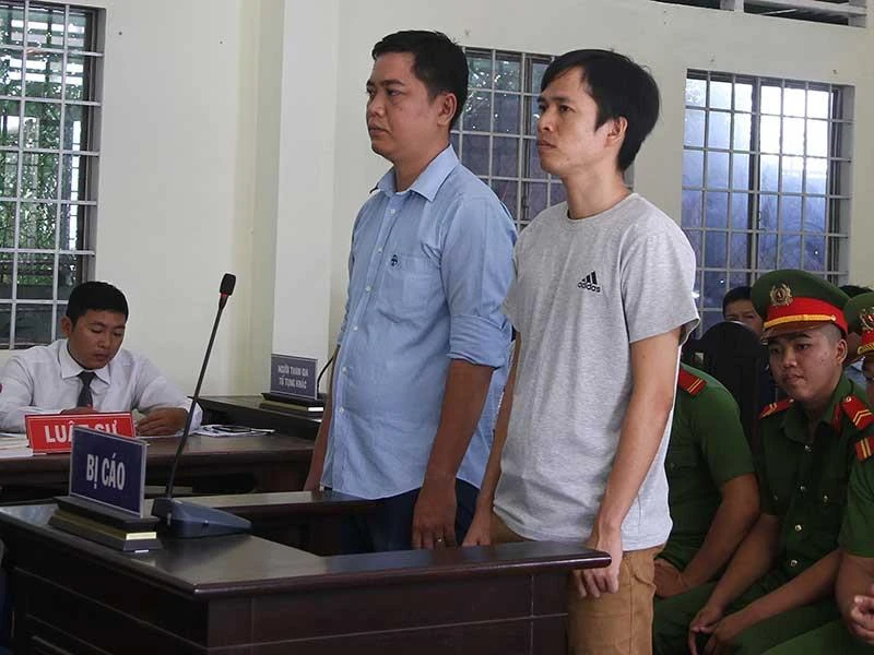 Hai bị cáo là cựu công an viên tại tòa ngày 9-7. Ảnh: HẢI DƯƠNG