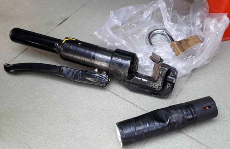 Đồ nghề bẻ khóa và bình xịt hơi cay đối tượng bỏ lại hiện trường.