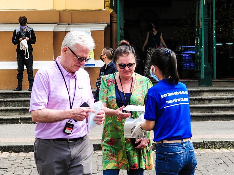 Khách du lịch từ các quốc gia khác đến Việt Nam giảm khá mạnh trong thời gian qua. Trong ảnh: Các công ty du lịch phát khẩu trang miễn phí cho du khách. Ảnh: TÚ UYÊN