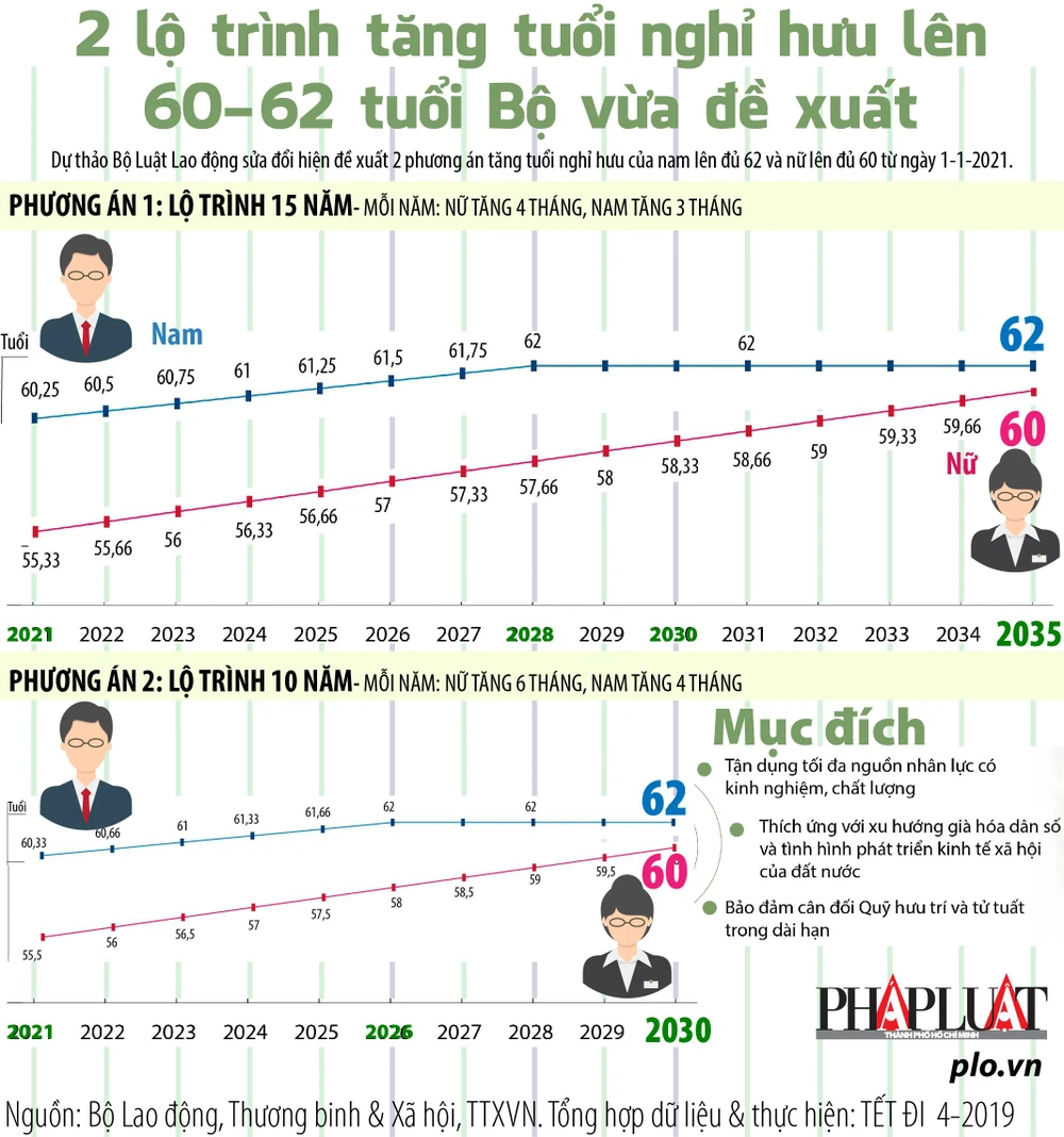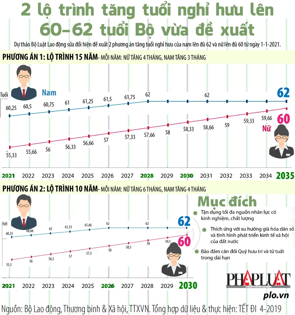 (PLO)- Dự thảo Bộ Luật Lao động sửa đổi hiện đề xuất hai phương án tăng tuổi nghỉ hưu của nam lên đủ 62 và nữ lên đủ 60 từ 1-1-2021 theo 2 lộ trình sau.