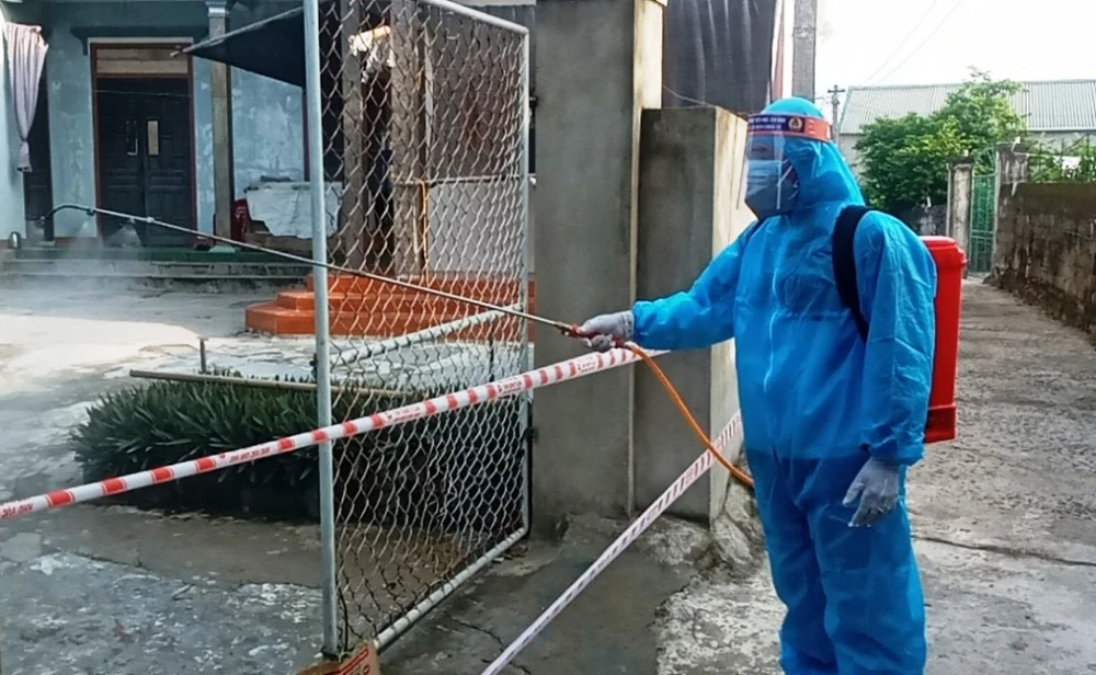 Phun khử khuẩn tại khu vực thôn Thống Nhất, xã Ích Hậu.