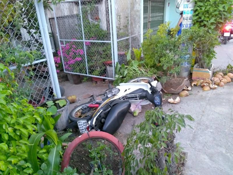 Mô tô 63B2-401.64 sau va chạm lao vào lề đường, tông bể nhiều chậu hoa cảnh của một hộ dân ven đường.