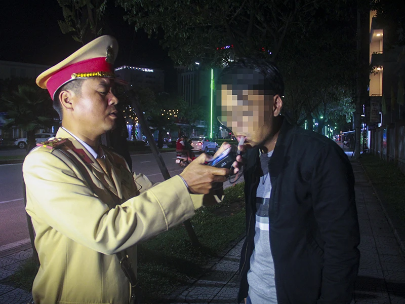 Công an TP Huế kiểm tra nồng độ cồn. Ảnh: B.TRÂM