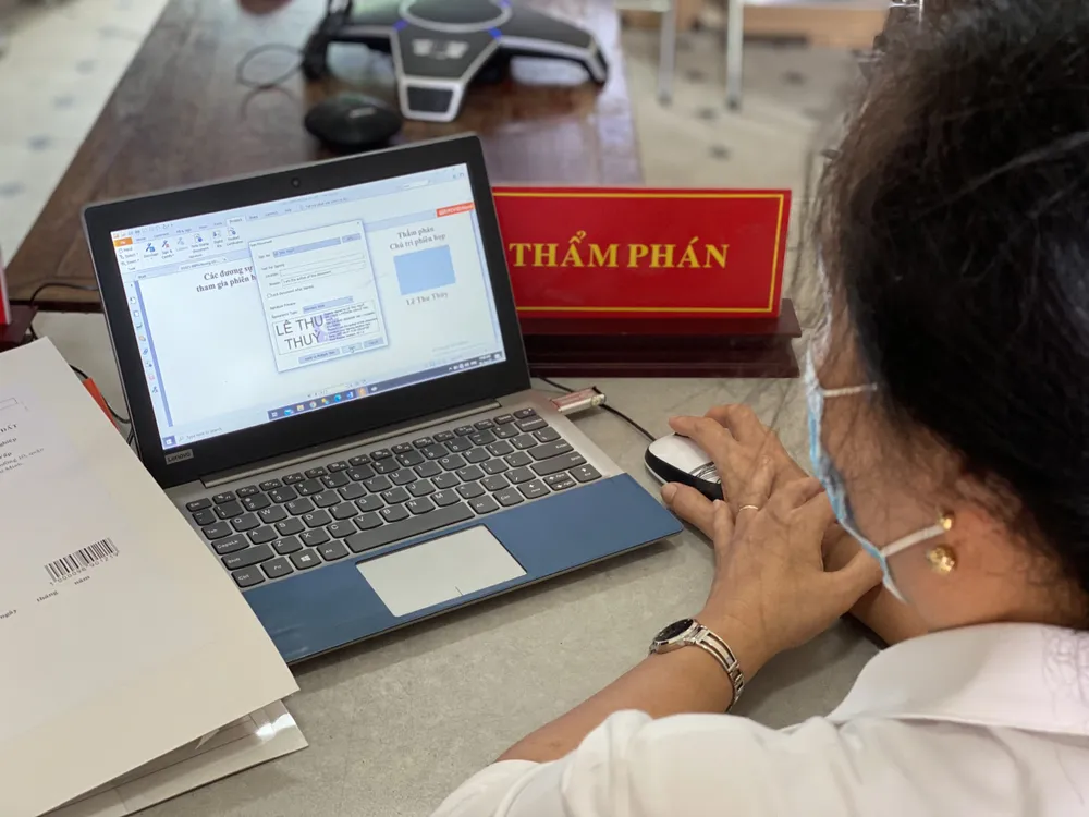 Thẩm phán đang tiến hành chữ ký điện tử tại phiên đối thoại trực tuyến. Ảnh: H.YẾN