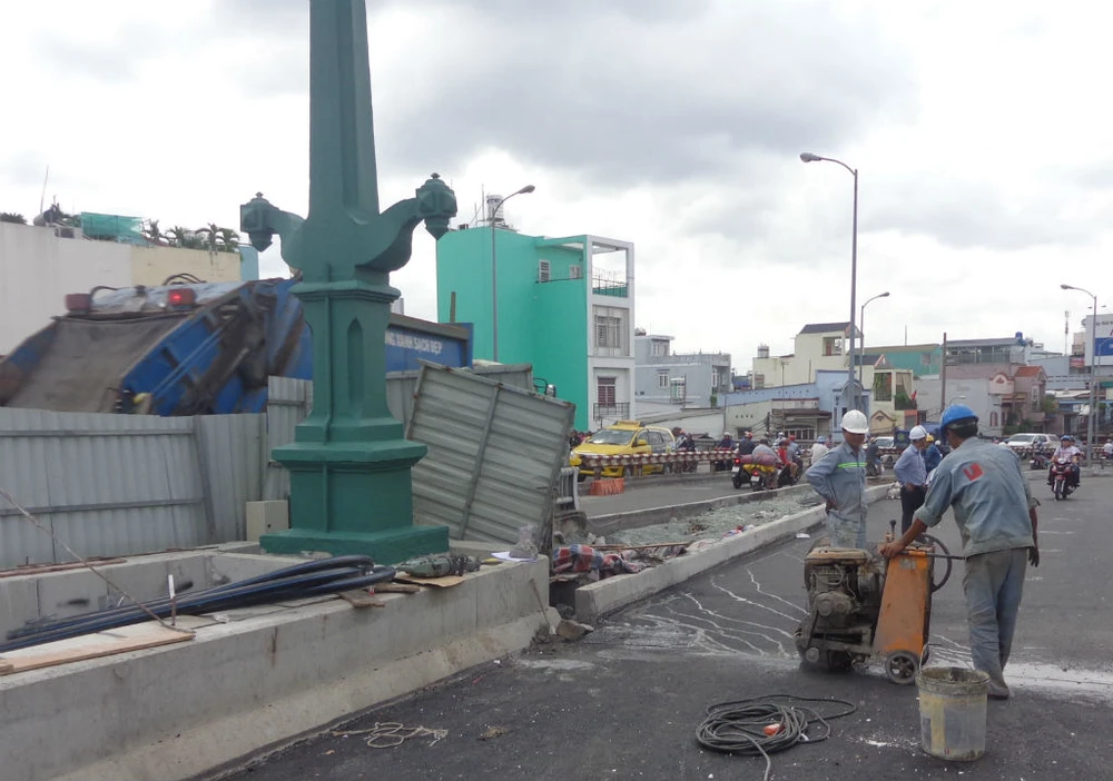 Cũng trong sáng nay, khe co giãn giữa phần cầu chính và đường dẫn xuống cầu hướng về quốc lộ 50 đang được gấp rút hoàn thiện. Điều dễ nhận thấy là ở vị trí tiếp giáp giữa nhịp cuối và mố trụ đường xuống cầu, người ta cho phục dựng lại thanh kiếm của cầu cũ đã gần 100 năm tuối. Đáng lưu ý là phần hai tai kiếm không đặt song song với mặt cầu và hướng người đi mà được đặt vuông góc.