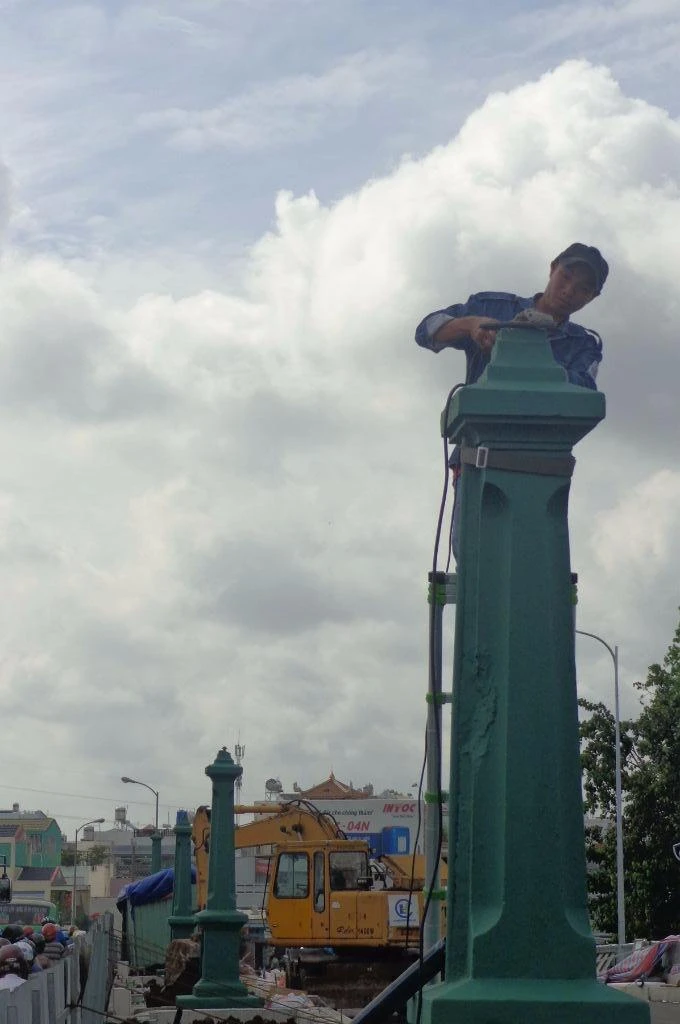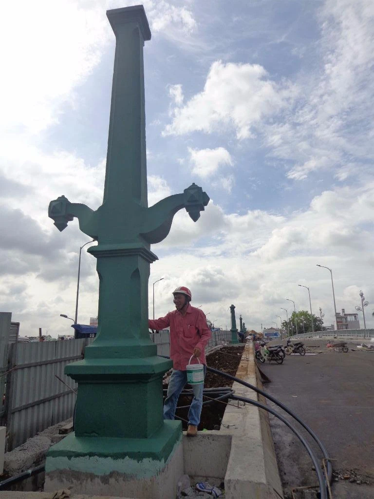 Hai cây kiếm ở hai đầu cầu đang được sơn phết lại đúng nguyên bản màu xanh. Ở phần chuôi kiếm, nằm sát với nền của dải phân cách cũng đã được tút lại sạch sẽ...