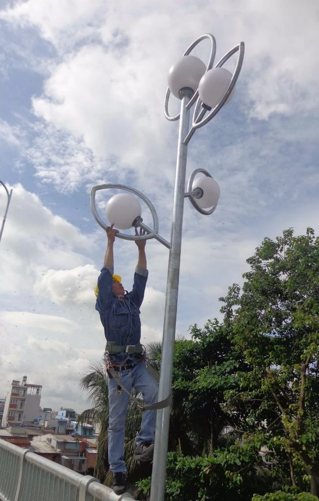 Một trong những cây đao được phục dựng nằm trên dải phân cách trồng hoa bên dưới và trên đỉnh là đèn LED chiếu sáng nằm trong quả cầu.